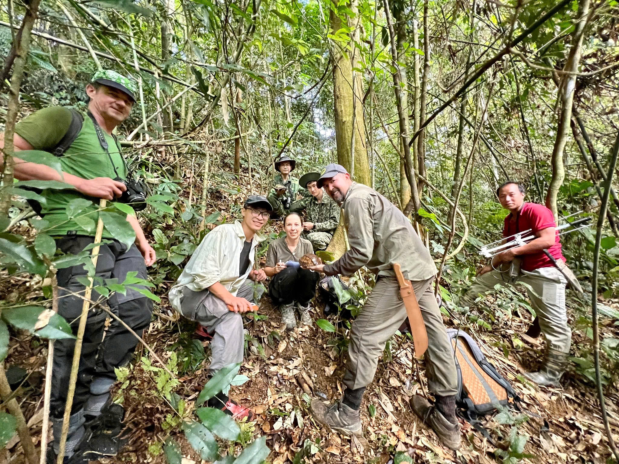 Hình 1: Hà Trí Sơn (áo trắng) theo dõi vô tuyến cá thể rùa hộp Đông Dương Cuora galbinifrons, loài rùa nguy cấp nhất thế giới, tại Khu Bảo tồn Thiên nhiên Xuân Liên năm 2023