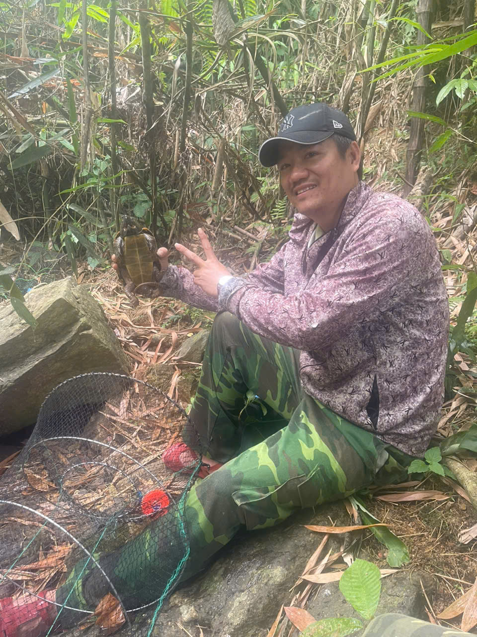 Hình 1: Năm 2024, Thắng cùng một cá thể rùa đầu to mà anh đã bẫy được trong quá trình nghiên cứu thực địa tại Khu bảo tồn thiên nhiên Nà Hẩu, tỉnh Yên Bái, Việt Nam